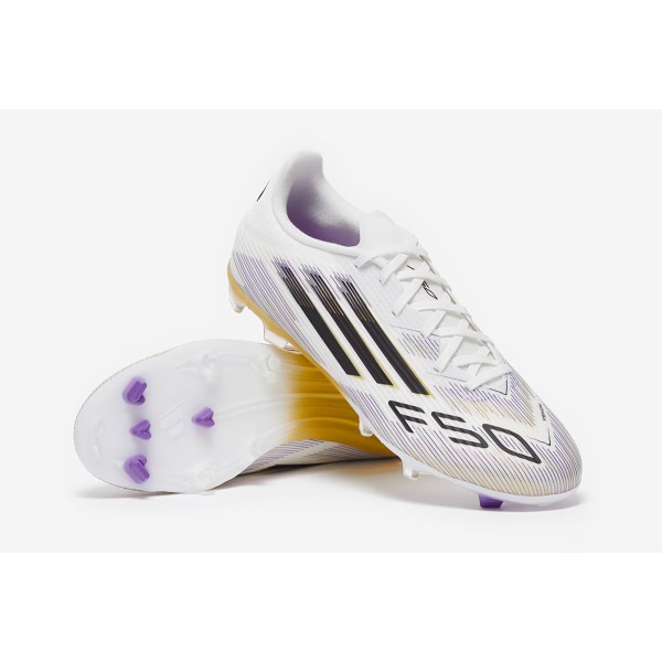 Ощутите новую скорость в футбольных бутсах Adidas F50 League FG JI0005 в бело-черно-золотистой расцветке.