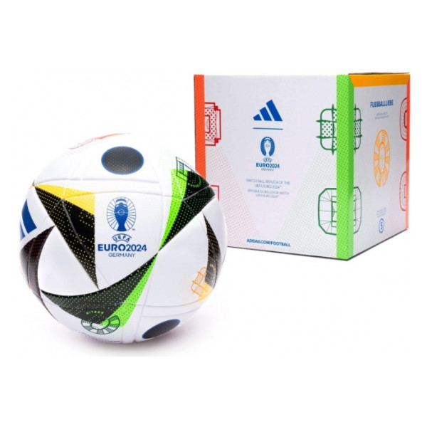Мяч Fussballliebe или «любовь к футболу» Лиги Евро-2024 оправдывает свое название благодаря высококачественным материалам, улучшающим игру, и яркой графике, прославляющей прекрасную игру. Абстрактные иллюстрации стадионов сверху вниз отдают дань уважения путешествию болельщиков по Германии, от Гамбурга до Мюнхена и от Дортмунда до Берлина, и они подбадривают свою страну к славе.